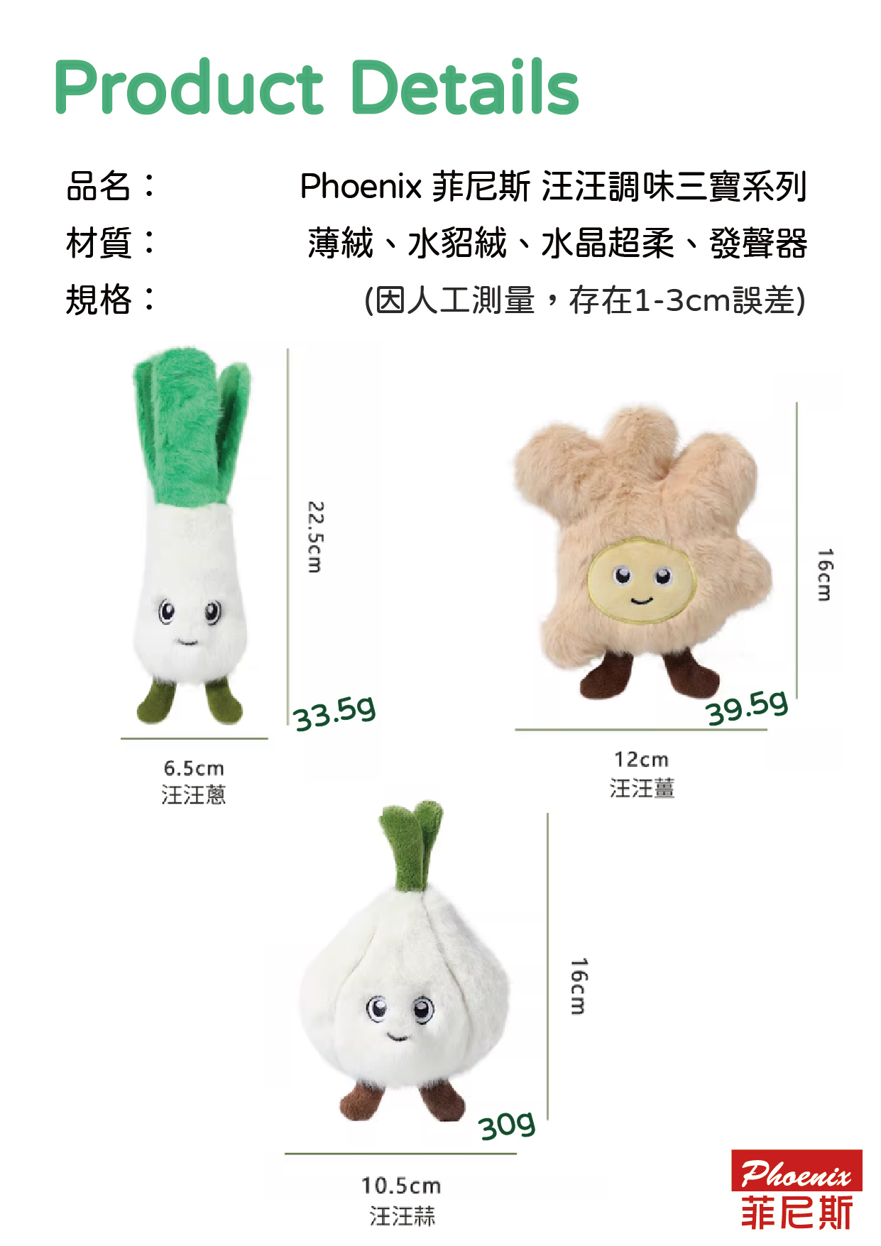 銷售據點 常見問題 Facebook 最新消息 會員登入 0 關於宬泰About us 新品專區New Product 營養保健/護理Care 關節保養 頂級魚油 舒緩軟膏 伊莉莎白頸圈 手術衣 喵星人洗手間 Cat Litter 豆腐砂 除臭粉 貓砂盆 掛鏟 落砂墊 洗澡清潔Cleaning 洗毛精 護毛潤絲 耳朵清潔 眼睛清潔 乾洗清潔 口腔清潔oral care 噴霧、潔牙水 指套、牙刷 潔淨牙膏 寵物零食Treats 細切條 其他形狀(柱型、圓片) 外出用品Outing 帳篷外出包 後背外出包 側背外出包 前背外出包 推車/推車配件 外出包拉桿車 汽車寵物用品 投影燈/水壺/碗 寵物配件Accessories 喵喵胸背/項圈 汪汪胸背/項圈 汪汪牽繩 撿便袋 狗狗玩具Dog Toy 互動錄音按鈕 磨牙啃咬 潔牙耐咬 絨毛陪伴 藏食互動 貓貓玩具Cat Toy 逗貓棒 貓草玩具 電動貓玩具 可愛小玩具 居家用品Pet Bed 床窩 貓吊床 貓抓板 寵物餐具 居家除臭 小寵用品Hamster 下場活動預告:展昭高雄寵物用品展12/12-15 高雄展覽館 獨霸場 南部最大寵物展 首頁 絨毛陪伴 汪汪調味三寶系列 (3 styles) 品牌:Phoenix菲尼斯 單位:個 款式: 請選擇 汪汪蔥 汪汪薑 汪汪蒜 數量: 1 2 3 原價: NT$ 255 會員價: NT$ 199 *汪汪蔥-蔥青部分含有響紙(薑、蒜不含響紙) *三款皆有BB發聲器 加入購物車 商品特色 商品成分 જ⁀➴♡可愛毛孩實拍影片點我觀看