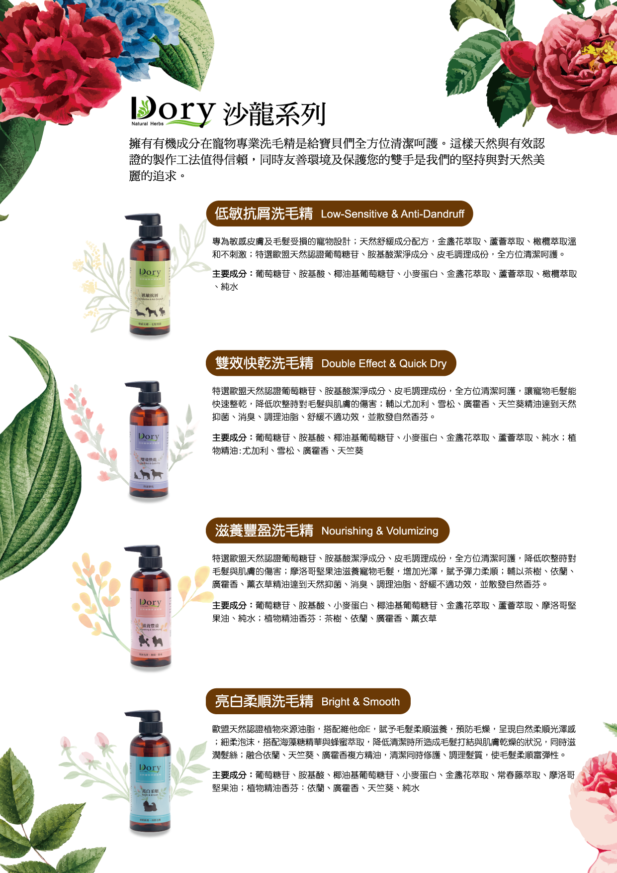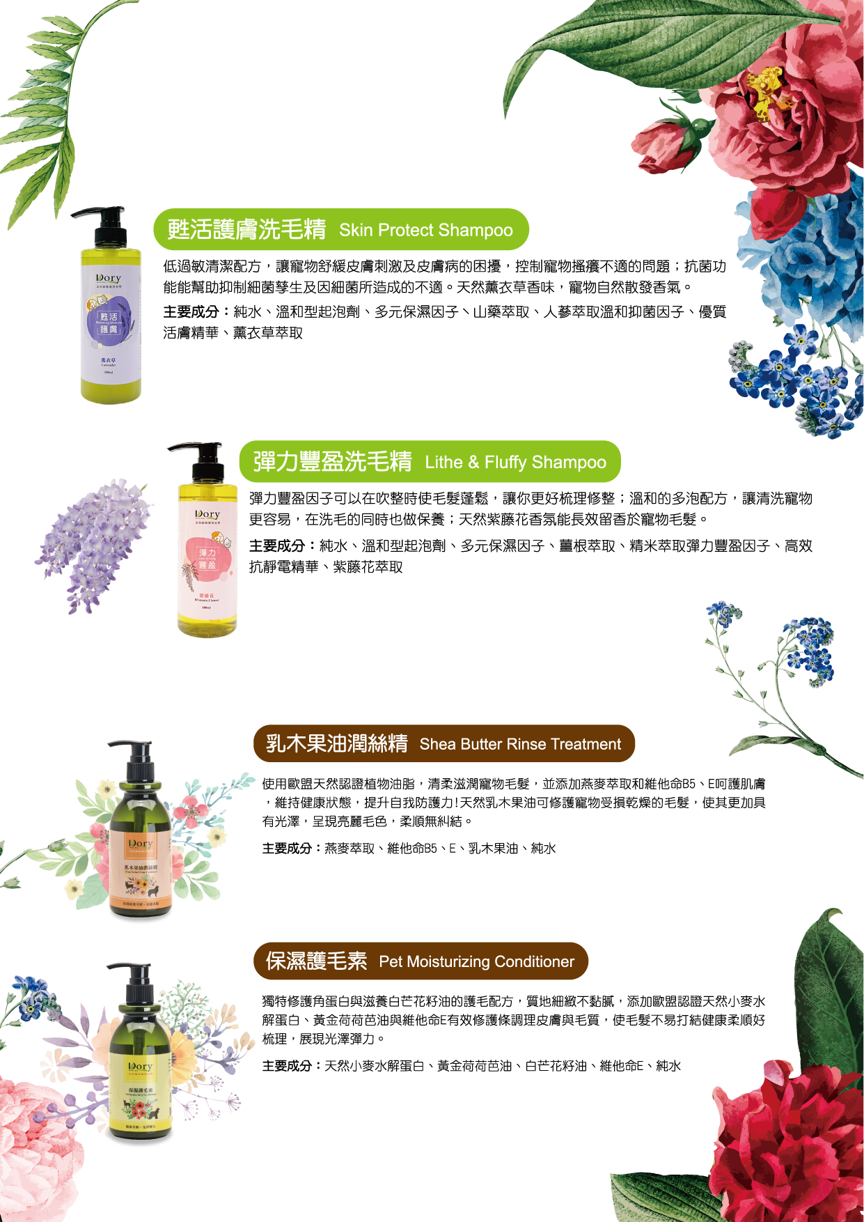 銷售據點 常見問題 Facebook 最新消息 會員登入 0 關於宬泰About us 新品專區New Product 38女王節Special offer 營養保健/護理Care 關節保養 頂級魚油 舒緩軟膏 伊莉莎白頸圈 手術衣 喵星人洗手間 Cat Litter 豆腐砂 除臭粉 貓砂盆 掛鏟 落砂墊 洗澡清潔Cleaning 洗毛精 護毛潤絲 耳朵清潔 眼睛清潔 乾洗清潔 口腔清潔oral care 噴霧、潔牙水 指套、牙刷 潔淨牙膏 寵物零食Treats 細切條 其他形狀(柱型、圓片) 外出用品Outing 帳篷外出包 後背外出包 側背外出包 前背外出包 推車/推車配件 外出包拉桿車 汽車寵物用品 投影燈/水壺/碗 寵物配件Accessories 喵喵胸背/項圈 汪汪胸背/項圈 汪汪牽繩 撿便袋 狗狗玩具Dog Toy 互動錄音按鈕 磨牙啃咬 潔牙耐咬 絨毛陪伴 藏食互動 貓貓玩具Cat Toy 逗貓棒 貓草玩具 電動貓玩具 可愛小玩具 居家用品Pet Bed 床窩 貓吊床 貓抓板 寵物餐具 居家除臭 小寵用品Hamster 福利專區Refurbished 下場活動預告:2026 5/15(五) - 5/18(一) 展昭台中寵物用品展-口碑場 首頁 38女王節 Dory 洗毛精+護毛/潤絲 (1+1) 品牌:Dory 朵莉 單位:組合 洗毛精: 請選擇 滋養豐盈洗毛精 400ml 亮白柔順洗毛精 400ml 雙效快乾洗毛精 400ml 低敏抗屑洗毛精 400ml 甦活護膚洗毛精(薰衣草) 500ml 彈力豐盈洗毛精(紫藤花) 500ml 護毛素(淡黃)/潤絲精(粉橘): 請選擇 保濕護毛素 乳木果油潤絲精 數量: 1 2 3 原價: NT$ 1090 會員價: NT$ 799 洗毛精六款 (擇一) + 護毛素/潤絲精 (擇一) 加入購物車 商品特色 商品成分