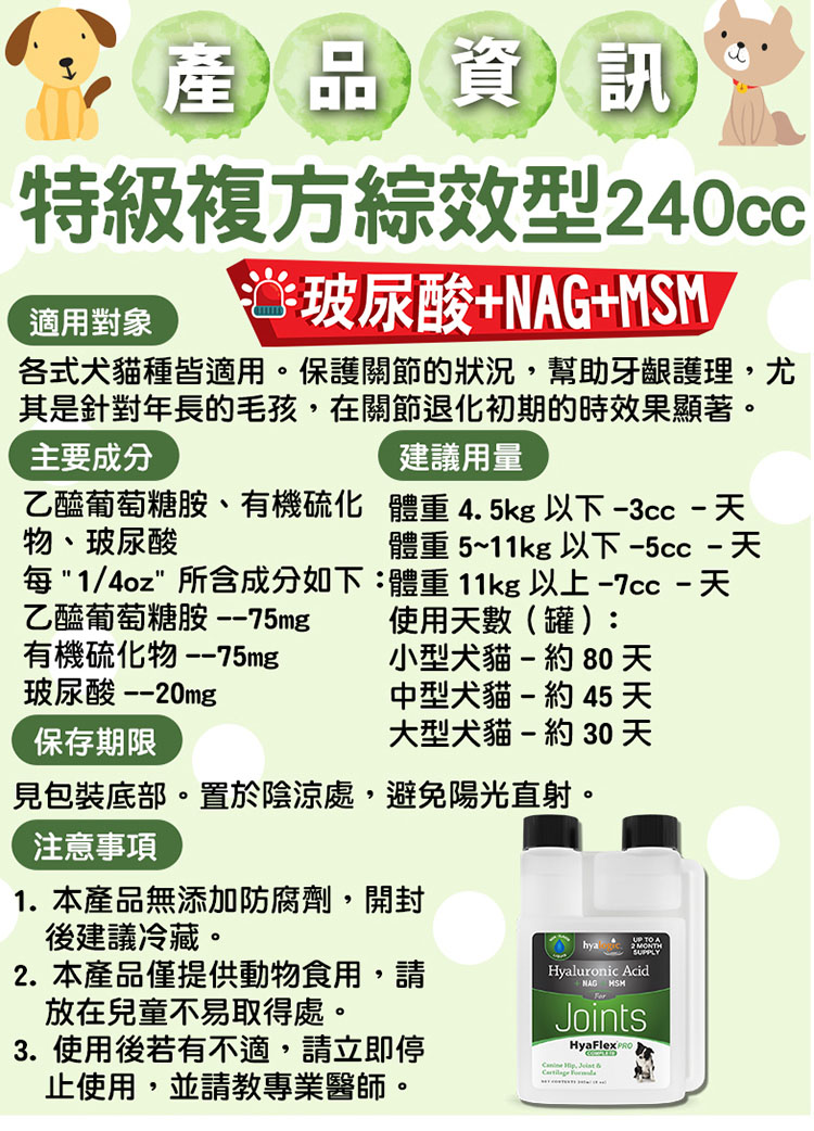 日常護理與營養保健: | 每"1/4 OZ"所含成分如下 N-乙醯葡萄糖胺---75mg MSM(有機硫化合物)--75mg 玻尿酸--20mg |