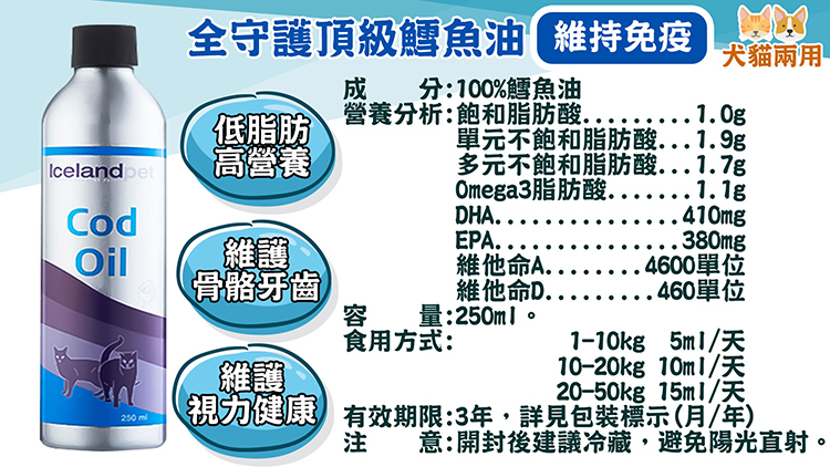 銷售據點 常見問題 Facebook 最新消息 會員登入 0 關於宬泰About us 新品專區New Product 營養保健/護理Care 關節保養 頂級魚油 舒緩軟膏 伊莉莎白頸圈 手術衣 喵星人洗手間 Cat Litter 豆腐砂 除臭粉 貓砂盆 掛鏟 落砂墊 洗澡清潔Cleaning 洗毛精 護毛潤絲 耳朵清潔 眼睛清潔 乾洗清潔 口腔清潔oral care 噴霧、潔牙水 指套、牙刷 潔淨牙膏 寵物零食Treats 細切條 其他形狀(柱型、圓片) 外出用品Outing 帳篷外出包 後背外出包 側背外出包 前背外出包 推車/推車配件 外出包拉桿車 汽車寵物用品 投影燈/水壺/碗 寵物配件Accessories 喵喵胸背/項圈 汪汪胸背/項圈 汪汪牽繩 撿便袋 狗狗玩具Dog Toy 互動錄音按鈕 磨牙啃咬 潔牙耐咬 絨毛陪伴 藏食互動 貓貓玩具Cat Toy 逗貓棒 貓草玩具 電動貓玩具 可愛小玩具 居家用品Pet Bed 床窩 貓吊床 貓抓板 寵物餐具 居家除臭 小寵用品Hamster 下場活動預告:展昭高雄寵物用品展12/12-15 高雄展覽館 獨霸場 南部最大寵物展 首頁 頂級魚油 全守護頂級魚油(犬貓兩用) 250ml 品牌:冰島伙伴icelandpet 單位:罐 規格: 請選擇 頂級Omega3魚油 頂級鱈魚油 數量: 1 2 3 原價: NT$ 950 會員價: NT$ 855 *鮭魚油已停產 加入購物車 商品特色 商品成分