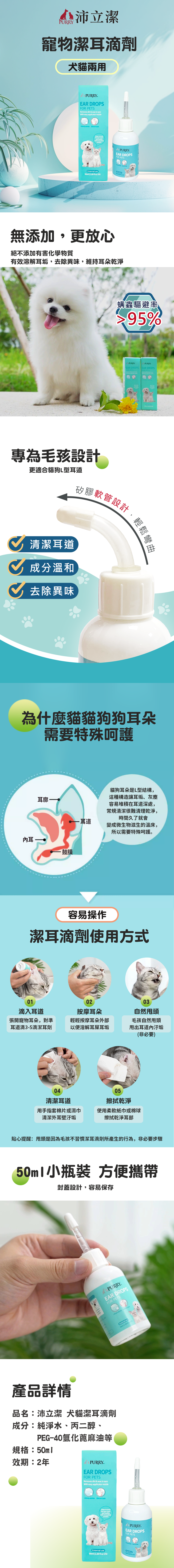 銷售據點 常見問題 Facebook 最新消息 會員登入 0 關於宬泰About us 新品專區New Product 營養保健/護理Care 關節保養 頂級魚油 舒緩軟膏 伊莉莎白頸圈 手術衣 喵星人洗手間 Cat Litter 豆腐砂 除臭粉 貓砂盆 掛鏟 落砂墊 洗澡清潔Cleaning 洗毛精 護毛潤絲 耳朵清潔 眼睛清潔 乾洗清潔 口腔清潔oral care 噴霧、潔牙水 指套、牙刷 潔淨牙膏 寵物零食Treats 細切條 其他形狀(柱型、圓片) 外出用品Outing 帳篷外出包 後背外出包 側背外出包 前背外出包 推車/推車配件 外出包拉桿車 汽車寵物用品 投影燈/水壺/碗 寵物配件Accessories 喵喵胸背/項圈 汪汪胸背/項圈 汪汪牽繩 撿便袋 狗狗玩具Dog Toy 互動錄音按鈕 磨牙啃咬 潔牙耐咬 絨毛陪伴 藏食互動 貓貓玩具Cat Toy 逗貓棒 貓草玩具 電動貓玩具 可愛小玩具 居家用品Pet Bed 床窩 貓吊床 貓抓板 寵物餐具 居家除臭 小寵用品Hamster 福利專區Refurbished 下場活動預告:2026 5/15(五) - 5/18(一) 展昭台中寵物用品展-口碑場 快來一起準備毛孩的聖誕禮物吧!!! 12/17-23 全館貓玩具78折 超耐咬Petopia狗狗玩具 12/24-12/30 享78%優惠 首頁 耳朵清潔 犬貓兩用潔耳滴劑50ml 品牌:Purry 沛立潔 單位:罐 規格: 請選擇 潔耳滴劑50ml 數量: 1 2 3 原價: NT$ 200 會員價: NT$ 180 加入購物車 商品特色 商品成分