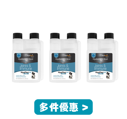 銷售據點 常見問題 Facebook 最新消息 會員登入 0 關於宬泰About us 新品專區New Product 營養保健/護理Care 關節保養 頂級魚油 舒緩軟膏 伊莉莎白頸圈 手術衣 喵星人洗手間 Cat Litter 豆腐砂 除臭粉 貓砂盆 掛鏟 落砂墊 洗澡清潔Cleaning 洗毛精 護毛潤絲 耳朵清潔 眼睛清潔 乾洗清潔 口腔清潔oral care 噴霧、潔牙水 指套、牙刷 潔淨牙膏 寵物零食Treats 細切條 其他形狀(柱型、圓片) 外出用品Outing 帳篷外出包 後背外出包 側背外出包 前背外出包 推車/推車配件 外出包拉桿車 汽車寵物用品 投影燈/水壺/碗 寵物配件Accessories 喵喵胸背/項圈 汪汪胸背/項圈 汪汪牽繩 撿便袋 狗狗玩具Dog Toy 互動錄音按鈕 磨牙啃咬 潔牙耐咬 絨毛陪伴 藏食互動 貓貓玩具Cat Toy 逗貓棒 貓草玩具 電動貓玩具 可愛小玩具 居家用品Pet Bed 床窩 貓吊床 貓抓板 寵物餐具 居家除臭 小寵用品Hamster 特惠專區Refurbished 下場活動預告:2026 5/15(五) - 5/18(一) 展昭台中寵物用品展-口碑場 首頁 關節保養 特級複方免疫型 240cc(8oz) 品牌:Hyalogic海亞好關節 單位:罐 規格: 請選擇 特級複方免疫型 特級複方免疫型2罐 特級複方免疫型3罐 特級複方免疫型6罐 數量: 1 2 3 原價: NT$ 1680 會員價: NT$ 1512 玻尿酸如需與食物一起使用,最佳食用時間在一小時內吃完,避免質變。 單罐 1512元 兩罐 2200元(平均1100/罐) 三罐 3170元(平均1057/罐) 六罐 5190元(平均865/罐) 加入購物車 商品特色 商品成分 毛主人請注意:玻尿酸如需與食物一起使用,最佳食用時間在一小時內吃完,避免質變。 強化骨關節,維持軟骨組織,對於愛活動的年輕愛犬及年長的愛犬都適用,尤其是大型犬及關節使用頻繁的犬隻。 保持關節的機動性和靈活性。 給愛犬健康的關節功能健康的軟骨功能。 不含防腐劑,且無色、無味。 素食可食、不含人工香料、高分子量、不含麩質。 各型 犬種皆適用,尤其是針對關節使用頻繁的大型犬、工作犬、敏捷犬或訓練比賽的犬隻,當年老因疼痛而感到不適的時候,特別好用。 愛犬若罹患關節炎將會出現下列徵兆: (1)走路時不順暢,會跛腳。 (2)坐下後,不易爬起。 (3)移動很不方便,移動的頻率也會減少,活動力差。 (4)長期的關節痛,受損的關節會痛、腫、僵硬,偶而會發出哀嗚聲音。 (5)行為改變:小狗對外界的刺激,反應變少,吠叫也變少。 《愛犬(貓)若出現以上徵兆,請諮詢合格獸醫師,並開始使用正確且有效的關節營養補品》 日常護理與營養保健: 1.提供舒服柔軟的睡床。 2.監控牠的體重。 3.確保狗狗做適度的運動,像是游泳。 4.補充關節營養品,像是玻尿酸、葡萄糖胺和軟骨素,來幫助關節得到滋潤。 5.增加飲食中的omega脂肪酸,幫助關節護理。 當小型犬邁入七歲、大型犬邁入5歲以上時,請開始注意關心他們的關節狀況,即時給予正確有效的關節保健食品,作為日常保健使用。 《所有資訊及產品不能被用於診斷、治療、治癒或預防任何疾病,也無法取代專業醫生的診斷及建議,對於資訊的任何錯誤、遺漏不負任何責任,亦無法對讀者應用本網站內容之結果負責。建議就身體狀況,向專業醫療人士尋求具體方案及處方,切勿拖延與濫用。》 主要用途 保護關節的狀況,非常適合年長的愛犬使用。 主要成分 Zinc Citrate(檸檬酸鋅) Hyaluronic Acid(玻尿酸) 每"1/4 OZ"所含成分如下 檸檬酸鋅---5mg 玻尿酸--20mg 玻尿酸 玻尿酸又名「透明質酸」,是廣泛存在於人體各部位的重要因子,包含構成人體細胞間質、眼睛的晶狀體、關節的潤滑等結締組織,可舒緩因關節磨損所造成的疼痛。 鋅 鋅是一種微量礦物質,維持毛孩健康的重要元素,從皮膚、毛髮、消化系統、免疫細胞...全都少不了它。為毛孩攝取充足的鋅,能幫助毛髮發育完整,更有助於維持免疫功能。