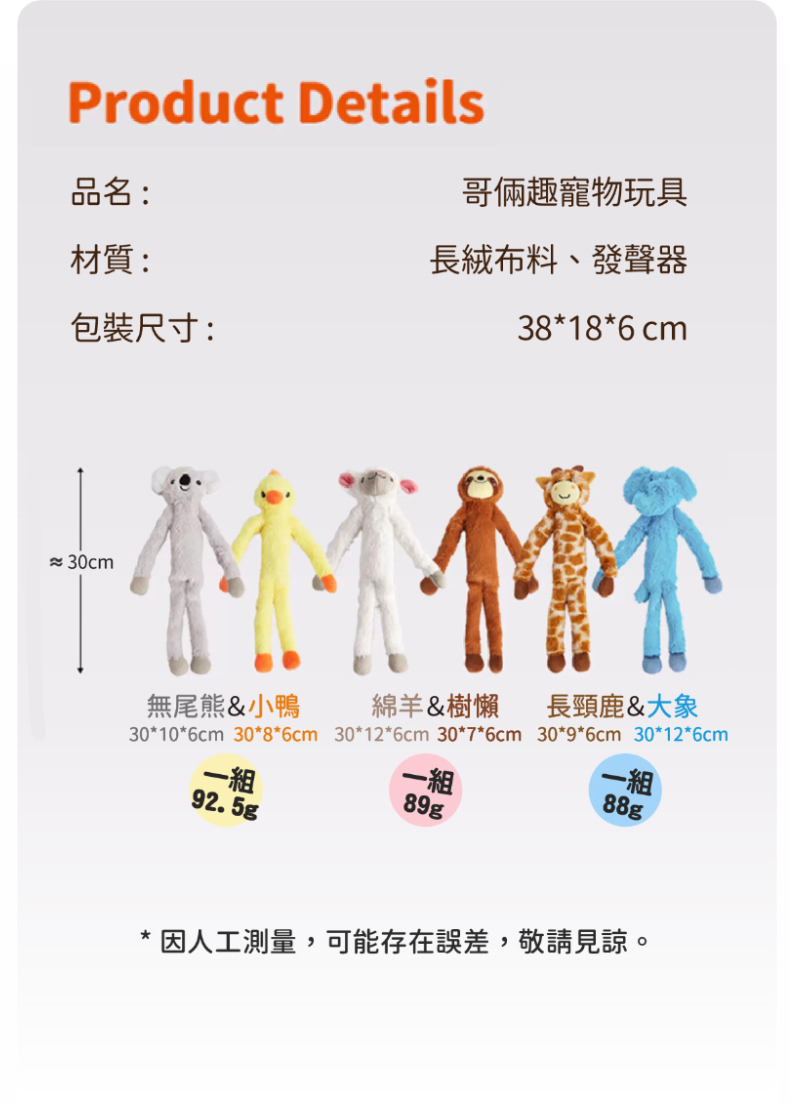銷售據點 常見問題 Facebook 最新消息 會員登入 0 關於宬泰About us 新品專區New Product 營養保健/護理Care 關節保養 頂級魚油 舒緩軟膏 伊莉莎白頸圈 手術衣 喵星人洗手間 Cat Litter 豆腐砂 除臭粉 貓砂盆 掛鏟 落砂墊 洗澡清潔Cleaning 洗毛精 護毛潤絲 耳朵清潔 眼睛清潔 乾洗清潔 口腔清潔oral care 噴霧、潔牙水 指套、牙刷 潔淨牙膏 寵物零食Treats 細切條 其他形狀(柱型、圓片) 外出用品Outing 帳篷外出包 後背外出包 側背外出包 前背外出包 推車/推車配件 外出包拉桿車 汽車寵物用品 投影燈/水壺/碗 寵物配件Accessories 喵喵胸背/項圈 汪汪胸背/項圈 汪汪牽繩 撿便袋 狗狗玩具Dog Toy 互動錄音按鈕 磨牙啃咬 潔牙耐咬 絨毛陪伴 藏食互動 貓貓玩具Cat Toy 逗貓棒 貓草玩具 電動貓玩具 可愛小玩具 居家用品Pet Bed 床窩 貓吊床 貓抓板 寵物餐具 居家除臭 小寵用品Hamster 特惠專區Refurbished 下場活動預告:2026 5/15(五) - 5/18(一) 展昭台中寵物用品展-口碑場 首頁 絨毛陪伴 哥倆趣寵物玩具系列 (3 styles) 品牌:FOFOS 單位:組 規格: 請選擇 無尾熊&小鴨 綿羊&樹懶 長頸鹿&大象 數量: 1 2 3 原價: NT$ 275 會員價: NT$ 248 加入購物車 商品特色 商品成分
