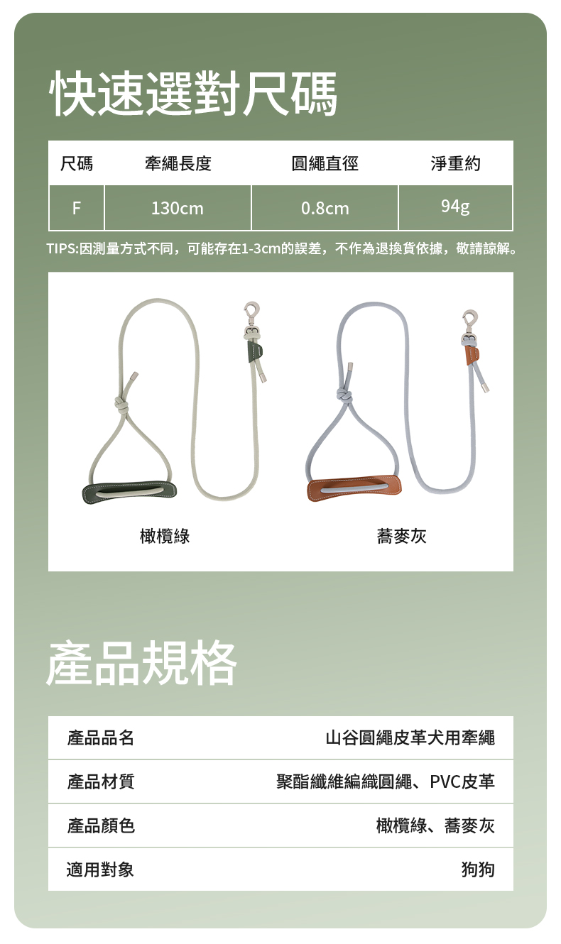 銷售據點 常見問題 Facebook 最新消息 會員登入 0 關於宬泰About us 新品專區New Product 營養保健/護理Care 關節保養 頂級魚油 舒緩軟膏 伊莉莎白頸圈 手術衣 喵星人洗手間 Cat Litter 豆腐砂 除臭粉 貓砂盆 掛鏟 落砂墊 洗澡清潔Cleaning 洗毛精 護毛潤絲 耳朵清潔 眼睛清潔 乾洗清潔 口腔清潔oral care 噴霧、潔牙水 指套、牙刷 潔淨牙膏 寵物零食Treats 細切條 其他形狀(柱型、圓片) 外出用品Outing 帳篷外出包 後背外出包 側背外出包 前背外出包 推車/推車配件 外出包拉桿車 汽車寵物用品 投影燈/水壺/碗 寵物配件Accessories 喵喵胸背/項圈 汪汪胸背/項圈 汪汪牽繩 撿便袋 狗狗玩具Dog Toy 互動錄音按鈕 磨牙啃咬 潔牙耐咬 絨毛陪伴 藏食互動 貓貓玩具Cat Toy 逗貓棒 貓草玩具 電動貓玩具 可愛小玩具 居家用品Pet Bed 床窩 貓吊床 貓抓板 寵物餐具 居家除臭 小寵用品Hamster 特惠專區Refurbished 下場活動預告:2026 5/15(五) - 5/18(一) 展昭台中寵物用品展-口碑場 首頁 汪汪牽繩 山谷系列-圓繩皮革犬用牽繩 (2 colors) 品牌:HiDREAM 單位:條 顏色: 請選擇 蕎麥灰 橄欖綠 數量: 1 2 3 原價: NT$ 570 會員價: NT$ 513 *可搭配超好看不勒愛寵的圓繩皮革犬用胸背喔~~ 加入購物車 商品特色 商品成分