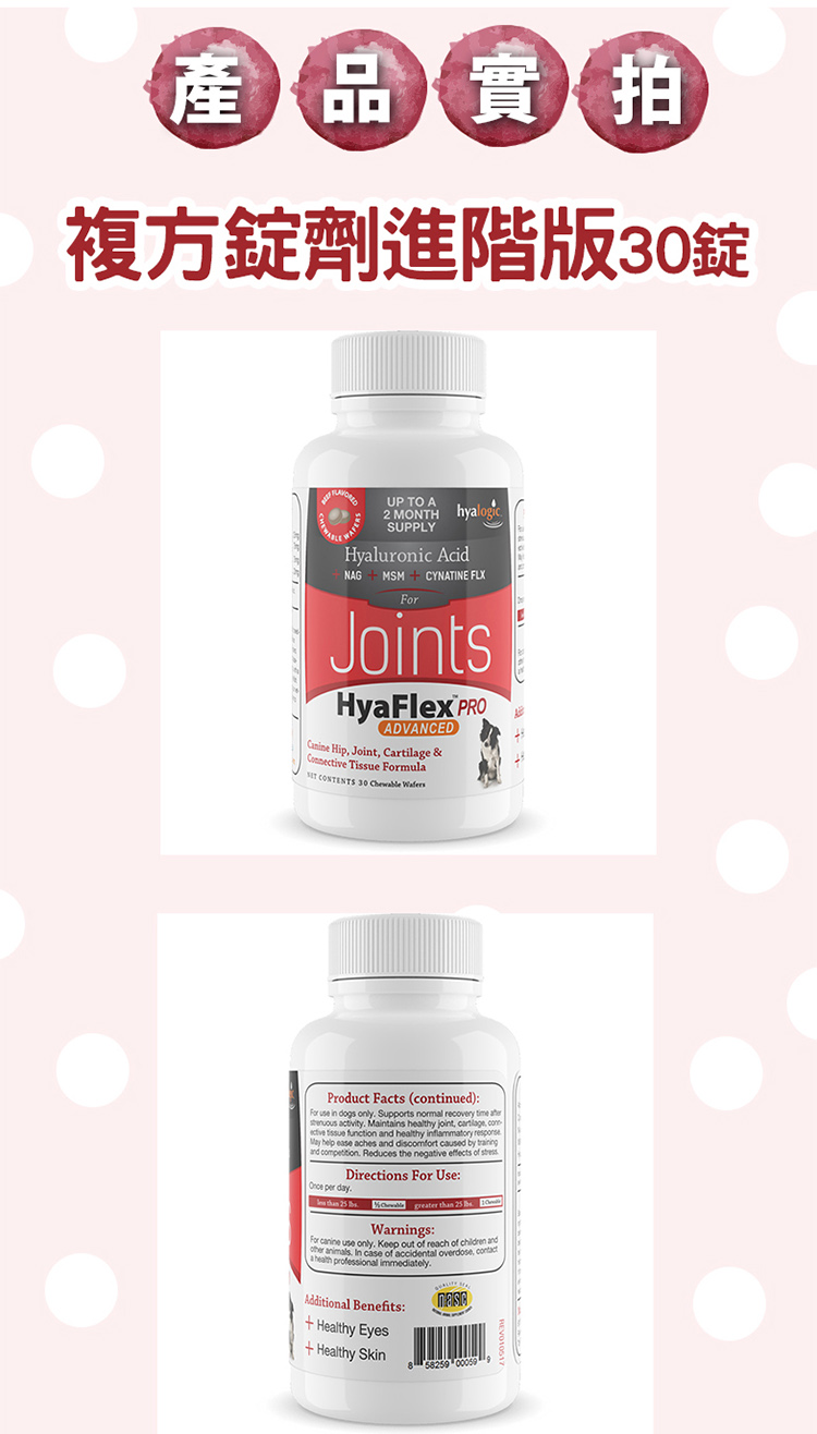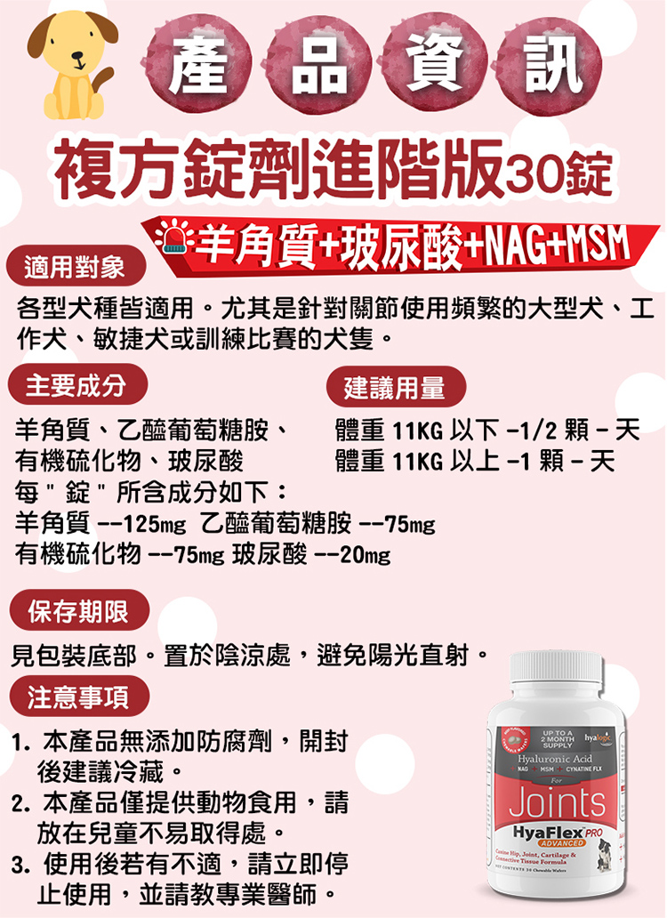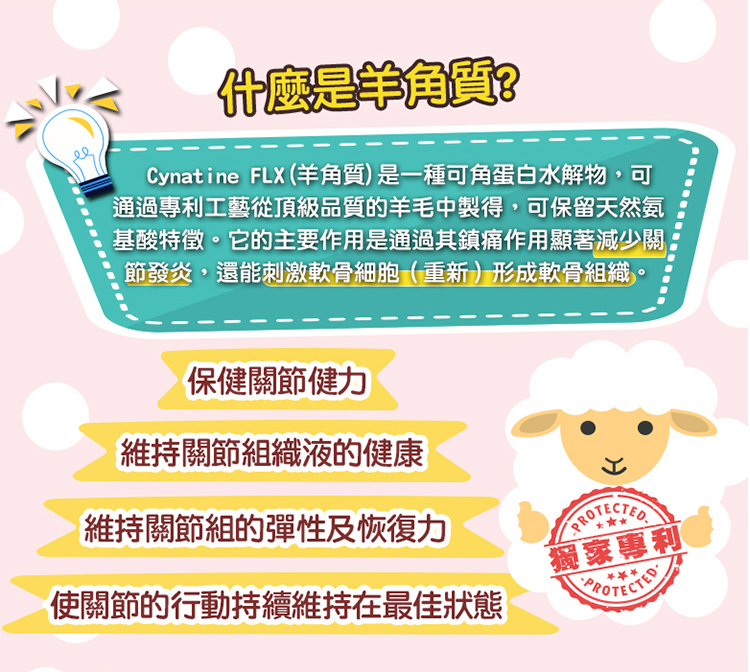 日常護理與營養保健: | 每"錠"所含成分如下 羊角質---125mg 葡萄糖胺--75mg MSM(有機硫化物)--75mg 玻尿酸--20mg |