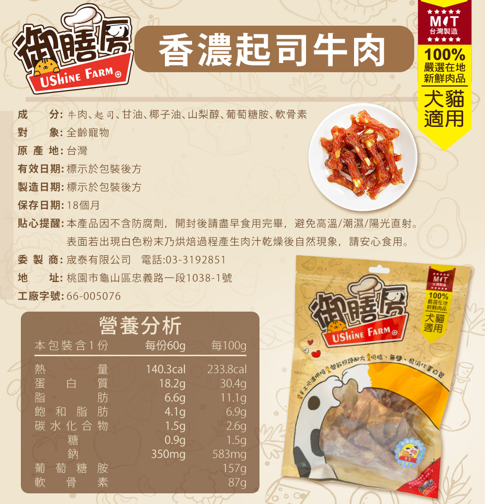 銷售據點 常見問題 Facebook 最新消息 會員登入 0 關於宬泰About us 新品專區New Product 38女王節Special offer 營養保健/護理Care 關節保養 頂級魚油 舒緩軟膏 伊莉莎白頸圈 手術衣 喵星人洗手間 Cat Litter 豆腐砂 除臭粉 貓砂盆 掛鏟 落砂墊 洗澡清潔Cleaning 洗毛精 護毛潤絲 耳朵清潔 眼睛清潔 乾洗清潔 口腔清潔oral care 噴霧、潔牙水 指套、牙刷 潔淨牙膏 寵物零食Treats 細切條 其他形狀(柱型、圓片) 外出用品Outing 帳篷外出包 後背外出包 側背外出包 前背外出包 推車/推車配件 外出包拉桿車 汽車寵物用品 投影燈/水壺/碗 寵物配件Accessories 喵喵胸背/項圈 汪汪胸背/項圈 汪汪牽繩 撿便袋 狗狗玩具Dog Toy 互動錄音按鈕 磨牙啃咬 潔牙耐咬 絨毛陪伴 藏食互動 貓貓玩具Cat Toy 逗貓棒 貓草玩具 電動貓玩具 可愛小玩具 居家用品Pet Bed 床窩 貓吊床 貓抓板 寵物餐具 居家除臭 小寵用品Hamster 福利專區Refurbished 下場活動預告:2026 5/15(五) - 5/18(一) 展昭台中寵物用品展-口碑場 首頁 其他形狀(柱型、圓片) 香濃牛肉起司(骨型)120g 品牌:Ushine farm御膳房 單位:包 規格: 請選擇 120g 數量: 1 2 3 原價: NT$ 250 會員價: NT$ 225 *可適用超商取貨/宅配方式* 加入購物車 商品特色 商品成分