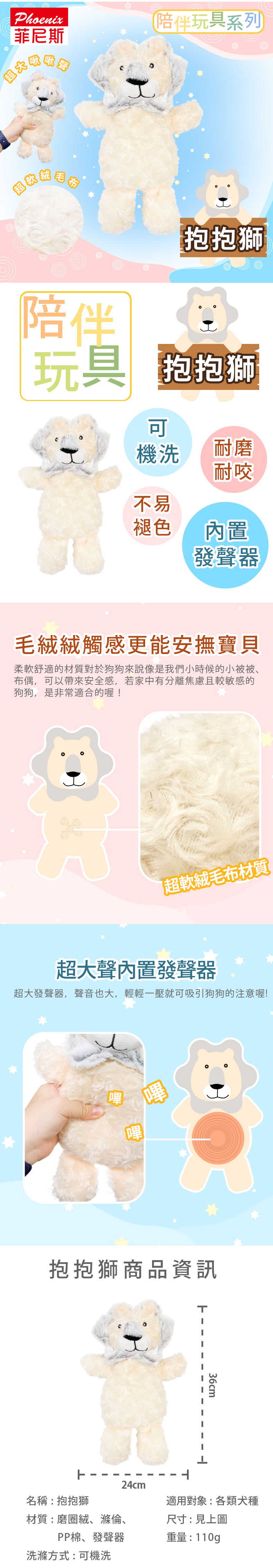 銷售據點 常見問題 Facebook 最新消息 會員登入 0 關於宬泰About us 新品專區New Product 營養保健/護理Care 關節保養 頂級魚油 舒緩軟膏 伊莉莎白頸圈 手術衣 喵星人洗手間 Cat Litter 豆腐砂 除臭粉 貓砂盆 掛鏟 落砂墊 洗澡清潔Cleaning 洗毛精 護毛潤絲 耳朵清潔 眼睛清潔 乾洗清潔 口腔清潔oral care 噴霧、潔牙水 指套、牙刷 潔淨牙膏 寵物零食Treats 細切條 其他形狀(柱型、圓片) 外出用品Outing 帳篷外出包 後背外出包 側背外出包 前背外出包 推車/推車配件 外出包拉桿車 汽車寵物用品 投影燈/水壺/碗 寵物配件Accessories 喵喵胸背/項圈 汪汪胸背/項圈 汪汪牽繩 撿便袋 狗狗玩具Dog Toy 互動錄音按鈕 磨牙啃咬 潔牙耐咬 絨毛陪伴 藏食互動 貓貓玩具Cat Toy 逗貓棒 貓草玩具 電動貓玩具 可愛小玩具 居家用品Pet Bed 床窩 貓吊床 貓抓板 寵物餐具 居家除臭 小寵用品Hamster 下場活動預告:展昭高雄寵物用品展12/12-15 高雄展覽館 獨霸場 南部最大寵物展 首頁 絨毛陪伴 絨毛陪伴系列-抱抱獅 品牌:Phoenix菲尼斯 單位:個 款式: 請選擇 抱抱獅 數量: 1 2 3 原價: NT$ 280 會員價: NT$ 252 加入購物車 商品特色 商品成分