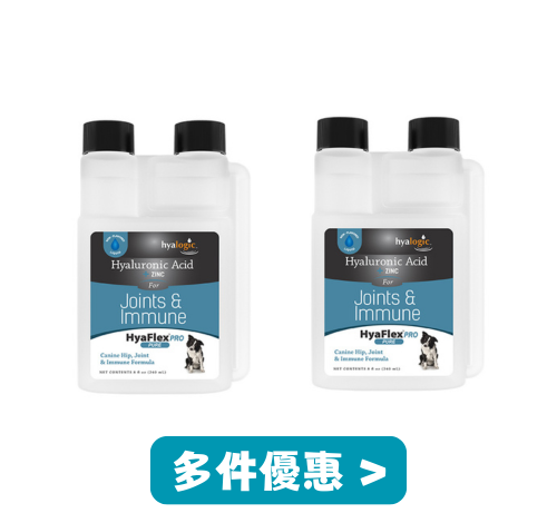 銷售據點 常見問題 Facebook 最新消息 會員登入 0 關於宬泰About us 新品專區New Product 營養保健/護理Care 關節保養 頂級魚油 舒緩軟膏 伊莉莎白頸圈 手術衣 喵星人洗手間 Cat Litter 豆腐砂 除臭粉 貓砂盆 掛鏟 落砂墊 洗澡清潔Cleaning 洗毛精 護毛潤絲 耳朵清潔 眼睛清潔 乾洗清潔 口腔清潔oral care 噴霧、潔牙水 指套、牙刷 潔淨牙膏 寵物零食Treats 細切條 其他形狀(柱型、圓片) 外出用品Outing 帳篷外出包 後背外出包 側背外出包 前背外出包 推車/推車配件 外出包拉桿車 汽車寵物用品 投影燈/水壺/碗 寵物配件Accessories 喵喵胸背/項圈 汪汪胸背/項圈 汪汪牽繩 撿便袋 狗狗玩具Dog Toy 互動錄音按鈕 磨牙啃咬 潔牙耐咬 絨毛陪伴 藏食互動 貓貓玩具Cat Toy 逗貓棒 貓草玩具 電動貓玩具 可愛小玩具 居家用品Pet Bed 床窩 貓吊床 貓抓板 寵物餐具 居家除臭 小寵用品Hamster 特惠專區Refurbished 下場活動預告:2026 5/15(五) - 5/18(一) 展昭台中寵物用品展-口碑場 首頁 關節保養 特級複方免疫型 240cc(8oz) 品牌:Hyalogic海亞好關節 單位:罐 規格: 請選擇 特級複方免疫型 特級複方免疫型2罐 特級複方免疫型3罐 特級複方免疫型6罐 數量: 1 2 3 原價: NT$ 1680 會員價: NT$ 1512 玻尿酸如需與食物一起使用,最佳食用時間在一小時內吃完,避免質變。 單罐 1512元 兩罐 2200元(平均1100/罐) 三罐 3170元(平均1057/罐) 六罐 5190元(平均865/罐) 加入購物車 商品特色 商品成分 毛主人請注意:玻尿酸如需與食物一起使用,最佳食用時間在一小時內吃完,避免質變。 強化骨關節,維持軟骨組織,對於愛活動的年輕愛犬及年長的愛犬都適用,尤其是大型犬及關節使用頻繁的犬隻。 保持關節的機動性和靈活性。 給愛犬健康的關節功能健康的軟骨功能。 不含防腐劑,且無色、無味。 素食可食、不含人工香料、高分子量、不含麩質。 各型 犬種皆適用,尤其是針對關節使用頻繁的大型犬、工作犬、敏捷犬或訓練比賽的犬隻,當年老因疼痛而感到不適的時候,特別好用。 愛犬若罹患關節炎將會出現下列徵兆: (1)走路時不順暢,會跛腳。 (2)坐下後,不易爬起。 (3)移動很不方便,移動的頻率也會減少,活動力差。 (4)長期的關節痛,受損的關節會痛、腫、僵硬,偶而會發出哀嗚聲音。 (5)行為改變:小狗對外界的刺激,反應變少,吠叫也變少。 《愛犬(貓)若出現以上徵兆,請諮詢合格獸醫師,並開始使用正確且有效的關節營養補品》 日常護理與營養保健: 1.提供舒服柔軟的睡床。 2.監控牠的體重。 3.確保狗狗做適度的運動,像是游泳。 4.補充關節營養品,像是玻尿酸、葡萄糖胺和軟骨素,來幫助關節得到滋潤。 5.增加飲食中的omega脂肪酸,幫助關節護理。 當小型犬邁入七歲、大型犬邁入5歲以上時,請開始注意關心他們的關節狀況,即時給予正確有效的關節保健食品,作為日常保健使用。 《所有資訊及產品不能被用於診斷、治療、治癒或預防任何疾病,也無法取代專業醫生的診斷及建議,對於資訊的任何錯誤、遺漏不負任何責任,亦無法對讀者應用本網站內容之結果負責。建議就身體狀況,向專業醫療人士尋求具體方案及處方,切勿拖延與濫用。》 主要用途 保護關節的狀況,非常適合年長的愛犬使用。 主要成分 Zinc Citrate(檸檬酸鋅) Hyaluronic Acid(玻尿酸) 每"1/4 OZ"所含成分如下 檸檬酸鋅---5mg 玻尿酸--20mg 玻尿酸 玻尿酸又名「透明質酸」,是廣泛存在於人體各部位的重要因子,包含構成人體細胞間質、眼睛的晶狀體、關節的潤滑等結締組織,可舒緩因關節磨損所造成的疼痛。 鋅 鋅是一種微量礦物質,維持毛孩健康的重要元素,從皮膚、毛髮、消化系統、免疫細胞...全都少不了它。為毛孩攝取充足的鋅,能幫助毛髮發育完整,更有助於維持免疫功能。
