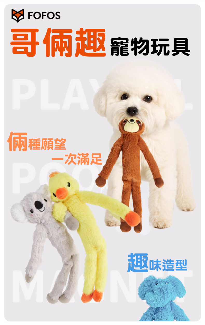銷售據點 常見問題 Facebook 最新消息 會員登入 0 關於宬泰About us 新品專區New Product 營養保健/護理Care 關節保養 頂級魚油 舒緩軟膏 伊莉莎白頸圈 手術衣 喵星人洗手間 Cat Litter 豆腐砂 除臭粉 貓砂盆 掛鏟 落砂墊 洗澡清潔Cleaning 洗毛精 護毛潤絲 耳朵清潔 眼睛清潔 乾洗清潔 口腔清潔oral care 噴霧、潔牙水 指套、牙刷 潔淨牙膏 寵物零食Treats 細切條 其他形狀(柱型、圓片) 外出用品Outing 帳篷外出包 後背外出包 側背外出包 前背外出包 推車/推車配件 外出包拉桿車 汽車寵物用品 投影燈/水壺/碗 寵物配件Accessories 喵喵胸背/項圈 汪汪胸背/項圈 汪汪牽繩 撿便袋 狗狗玩具Dog Toy 互動錄音按鈕 磨牙啃咬 潔牙耐咬 絨毛陪伴 藏食互動 貓貓玩具Cat Toy 逗貓棒 貓草玩具 電動貓玩具 可愛小玩具 居家用品Pet Bed 床窩 貓吊床 貓抓板 寵物餐具 居家除臭 小寵用品Hamster 特惠專區Refurbished 下場活動預告:2026 5/15(五) - 5/18(一) 展昭台中寵物用品展-口碑場 首頁 絨毛陪伴 哥倆趣寵物玩具系列 (3 styles) 品牌:FOFOS 單位:組 規格: 請選擇 無尾熊&小鴨 綿羊&樹懶 長頸鹿&大象 數量: 1 2 3 原價: NT$ 275 會員價: NT$ 248 加入購物車 商品特色 商品成分