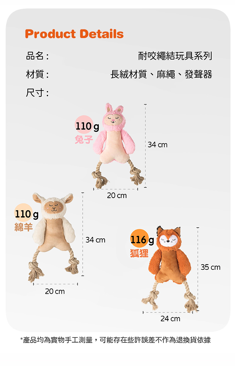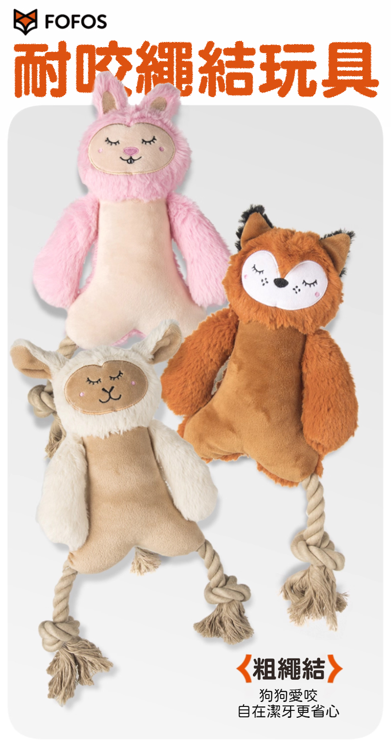 銷售據點 常見問題 Facebook 最新消息 會員登入 0 關於宬泰About us 新品專區New Product 營養保健/護理Care 關節保養 頂級魚油 舒緩軟膏 伊莉莎白頸圈 手術衣 喵星人洗手間 Cat Litter 豆腐砂 除臭粉 貓砂盆 掛鏟 落砂墊 洗澡清潔Cleaning 洗毛精 護毛潤絲 耳朵清潔 眼睛清潔 乾洗清潔 口腔清潔oral care 噴霧、潔牙水 指套、牙刷 潔淨牙膏 寵物零食Treats 細切條 其他形狀(柱型、圓片) 外出用品Outing 帳篷外出包 後背外出包 側背外出包 前背外出包 推車/推車配件 外出包拉桿車 汽車寵物用品 投影燈/水壺/碗 寵物配件Accessories 喵喵胸背/項圈 汪汪胸背/項圈 汪汪牽繩 撿便袋 狗狗玩具Dog Toy 互動錄音按鈕 磨牙啃咬 潔牙耐咬 絨毛陪伴 藏食互動 貓貓玩具Cat Toy 逗貓棒 貓草玩具 電動貓玩具 可愛小玩具 居家用品Pet Bed 床窩 貓吊床 貓抓板 寵物餐具 居家除臭 小寵用品Hamster 特惠專區Refurbished 下場活動預告:2026 5/15(五) - 5/18(一) 展昭台中寵物用品展-口碑場 首頁 絨毛陪伴 毛絨耐咬結繩玩具 (3 styles) 品牌:FOFOS 單位:個 規格: 請選擇 兔子 狐狸 綿羊 數量: 1 2 3 原價: NT$ 220 會員價: NT$ 198 加入購物車 商品特色 商品成分