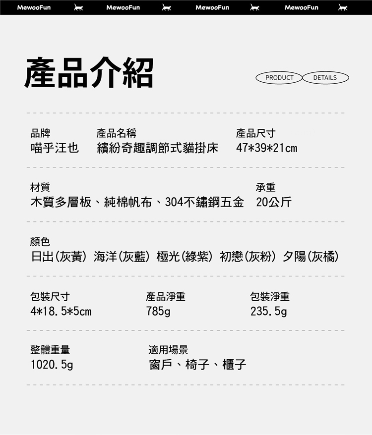 銷售據點 常見問題 Facebook 最新消息 會員登入 0 關於宬泰About us 新品專區New Product 營養保健/護理Care 關節保養 頂級魚油 舒緩軟膏 伊莉莎白頸圈 手術衣 喵星人洗手間 Cat Litter 豆腐砂 除臭粉 貓砂盆 掛鏟 落砂墊 洗澡清潔Cleaning 洗毛精 護毛潤絲 耳朵清潔 眼睛清潔 乾洗清潔 口腔清潔oral care 噴霧、潔牙水 指套、牙刷 潔淨牙膏 寵物零食Treats 細切條 其他形狀(柱型、圓片) 外出用品Outing 帳篷外出包 後背外出包 側背外出包 前背外出包 推車/推車配件 外出包拉桿車 汽車寵物用品 投影燈/水壺/碗 寵物配件Accessories 喵喵胸背/項圈 汪汪胸背/項圈 汪汪牽繩 撿便袋 狗狗玩具Dog Toy 互動錄音按鈕 磨牙啃咬 潔牙耐咬 絨毛陪伴 藏食互動 貓貓玩具Cat Toy 逗貓棒 貓草玩具 電動貓玩具 可愛小玩具 居家用品Pet Bed 床窩 貓吊床 貓抓板 寵物餐具 居家除臭 小寵用品Hamster 福利專區Refurbished 下場活動預告:2026 5/15(五) - 5/18(一) 展昭台中寵物用品展-口碑場 首頁 福利專區 繽紛奇趣調節式貓吊床 品牌:MewooFun喵乎汪也 單位:個 款式: 請選擇 海洋 日出 極光 數量: 1 2 3 原價: NT$ 1280 會員價: NT$ 640 *特價福利商品售出不再做退換貨 *數量有限,售完絕版 日出款:13 海洋款:12 極光款:1 加入購物車 商品特色 商品成分