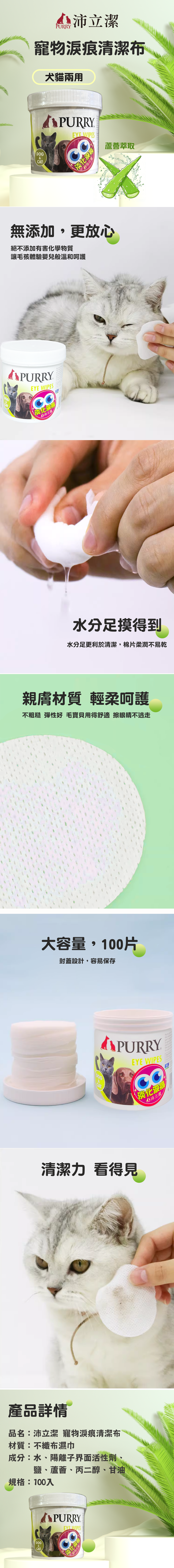 銷售據點 常見問題 Facebook 最新消息 會員登入 0 關於宬泰About us 新品專區New Product 營養保健/護理Care 關節保養 頂級魚油 舒緩軟膏 伊莉莎白頸圈 手術衣 喵星人洗手間 Cat Litter 豆腐砂 除臭粉 貓砂盆 掛鏟 落砂墊 洗澡清潔Cleaning 洗毛精 護毛潤絲 耳朵清潔 眼睛清潔 乾洗清潔 口腔清潔oral care 噴霧、潔牙水 指套、牙刷 潔淨牙膏 寵物零食Treats 細切條 其他形狀(柱型、圓片) 外出用品Outing 帳篷外出包 後背外出包 側背外出包 前背外出包 推車/推車配件 外出包拉桿車 汽車寵物用品 投影燈/水壺/碗 寵物配件Accessories 喵喵胸背/項圈 汪汪胸背/項圈 汪汪牽繩 撿便袋 狗狗玩具Dog Toy 互動錄音按鈕 磨牙啃咬 潔牙耐咬 絨毛陪伴 藏食互動 貓貓玩具Cat Toy 逗貓棒 貓草玩具 電動貓玩具 可愛小玩具 居家用品Pet Bed 床窩 貓吊床 貓抓板 寵物餐具 居家除臭 小寵用品Hamster 福利專區Refurbished 下場活動預告:2026 5/15(五) - 5/18(一) 展昭台中寵物用品展-口碑場 首頁 眼睛清潔 犬貓兩用淚痕清潔布(蘆薈)100入 品牌:Purry 沛立潔 單位:罐 規格: 請選擇 蘆薈萃取 數量: 1 2 3 原價: NT$ 200 會員價: NT$ 180 加入購物車 商品特色 商品成分