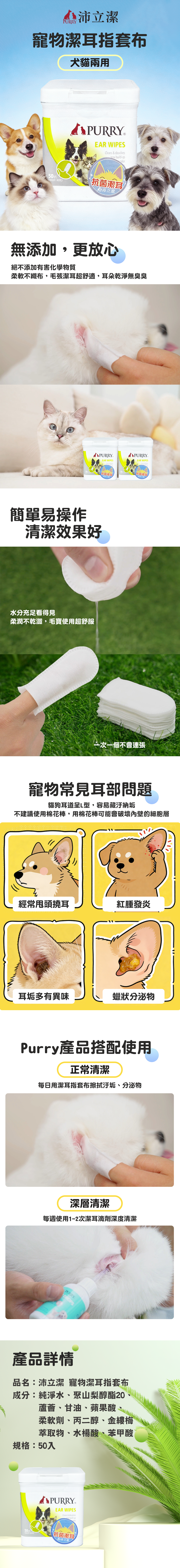 銷售據點 常見問題 Facebook 最新消息 會員登入 0 關於宬泰About us 新品專區New Product 營養保健/護理Care 關節保養 頂級魚油 舒緩軟膏 伊莉莎白頸圈 手術衣 喵星人洗手間 Cat Litter 豆腐砂 除臭粉 貓砂盆 掛鏟 落砂墊 洗澡清潔Cleaning 洗毛精 護毛潤絲 耳朵清潔 眼睛清潔 乾洗清潔 口腔清潔oral care 噴霧、潔牙水 指套、牙刷 潔淨牙膏 寵物零食Treats 細切條 其他形狀(柱型、圓片) 外出用品Outing 帳篷外出包 後背外出包 側背外出包 前背外出包 推車/推車配件 外出包拉桿車 汽車寵物用品 投影燈/水壺/碗 寵物配件Accessories 喵喵胸背/項圈 汪汪胸背/項圈 汪汪牽繩 撿便袋 狗狗玩具Dog Toy 互動錄音按鈕 磨牙啃咬 潔牙耐咬 絨毛陪伴 藏食互動 貓貓玩具Cat Toy 逗貓棒 貓草玩具 電動貓玩具 可愛小玩具 居家用品Pet Bed 床窩 貓吊床 貓抓板 寵物餐具 居家除臭 小寵用品Hamster 福利專區Refurbished 下場活動預告:2026 5/15(五) - 5/18(一) 展昭台中寵物用品展-口碑場 首頁 耳朵清潔 犬貓兩用潔耳指套布50入 品牌:Purry 沛立潔 單位:罐 規格: 請選擇 潔耳指套布 數量: 1 2 3 原價: NT$ 200 會員價: NT$ 180 加入購物車 商品特色 商品成分