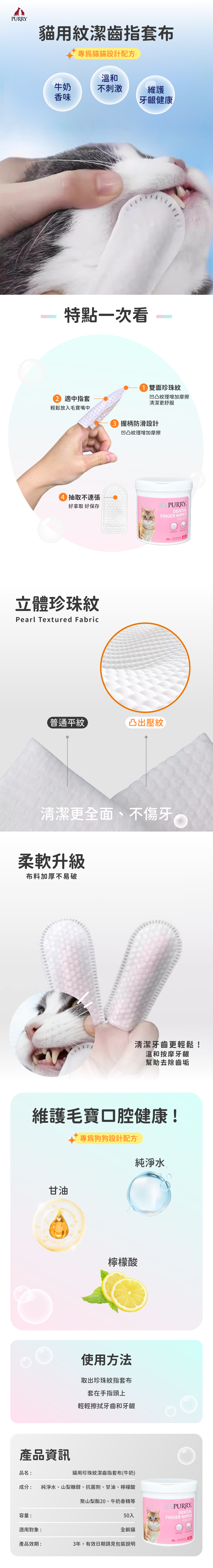 銷售據點 常見問題 Facebook 最新消息 會員登入 0 關於宬泰About us 新品專區New Product 營養保健/護理Care 關節保養 頂級魚油 舒緩軟膏 伊莉莎白頸圈 手術衣 喵星人洗手間 Cat Litter 豆腐砂 除臭粉 貓砂盆 掛鏟 落砂墊 洗澡清潔Cleaning 洗毛精 護毛潤絲 耳朵清潔 眼睛清潔 乾洗清潔 口腔清潔oral care 噴霧、潔牙水 指套、牙刷 潔淨牙膏 寵物零食Treats 細切條 其他形狀(柱型、圓片) 外出用品Outing 帳篷外出包 後背外出包 側背外出包 前背外出包 推車/推車配件 外出包拉桿車 汽車寵物用品 投影燈/水壺/碗 寵物配件Accessories 喵喵胸背/項圈 汪汪胸背/項圈 汪汪牽繩 撿便袋 狗狗玩具Dog Toy 互動錄音按鈕 磨牙啃咬 潔牙耐咬 絨毛陪伴 藏食互動 貓貓玩具Cat Toy 逗貓棒 貓草玩具 電動貓玩具 可愛小玩具 居家用品Pet Bed 床窩 貓吊床 貓抓板 寵物餐具 居家除臭 小寵用品Hamster 福利專區Refurbished 下場活動預告:2026 5/15(五) - 5/18(一) 展昭台中寵物用品展-口碑場 首頁 指套、牙刷 貓用珍珠紋潔齒指套布50入(牛奶) 品牌:Purry沛立潔 單位:罐 規格: 請選擇 貓用潔齒指套布 數量: 1 2 3 原價: NT$ 300 會員價: NT$ 270 加入購物車 商品特色 商品成分